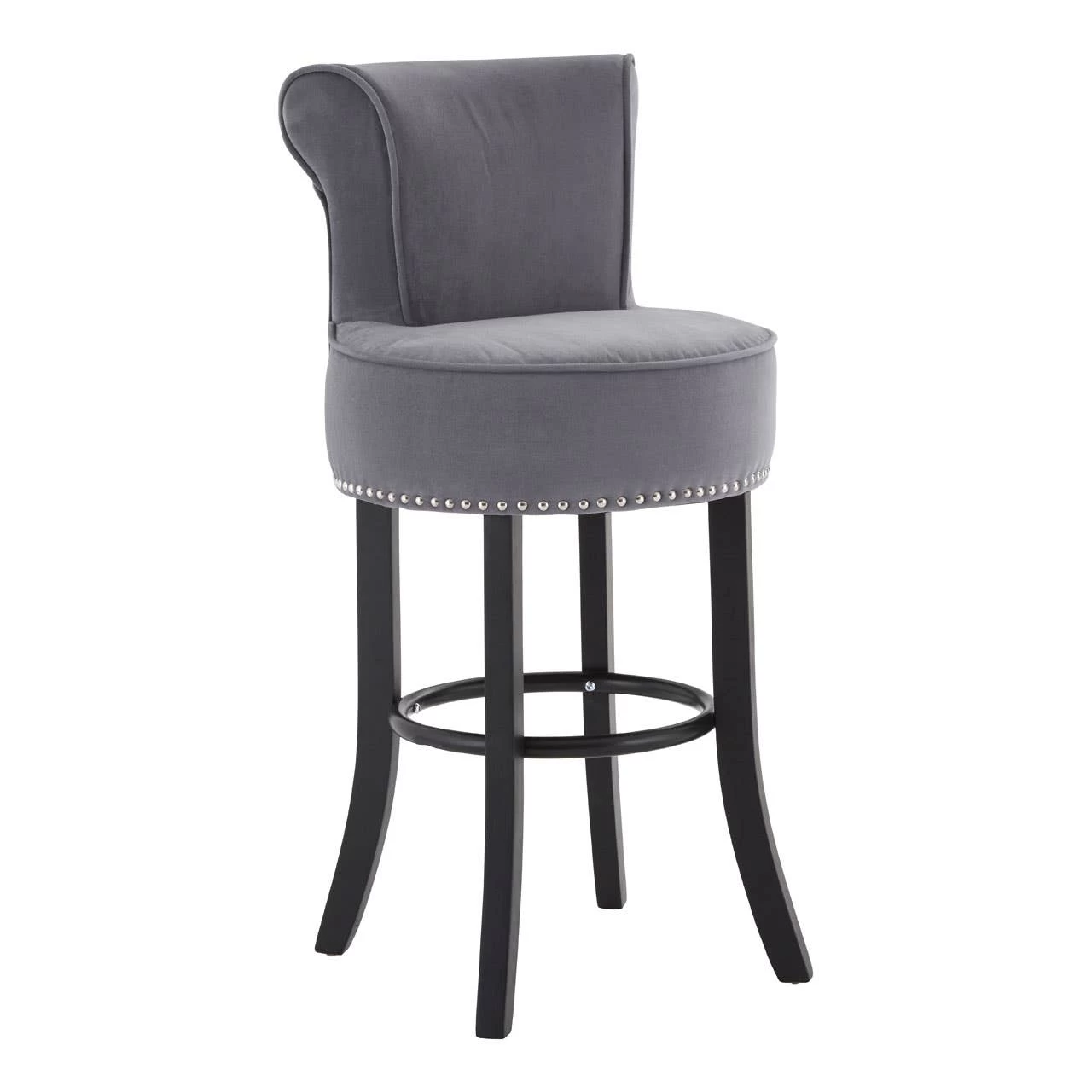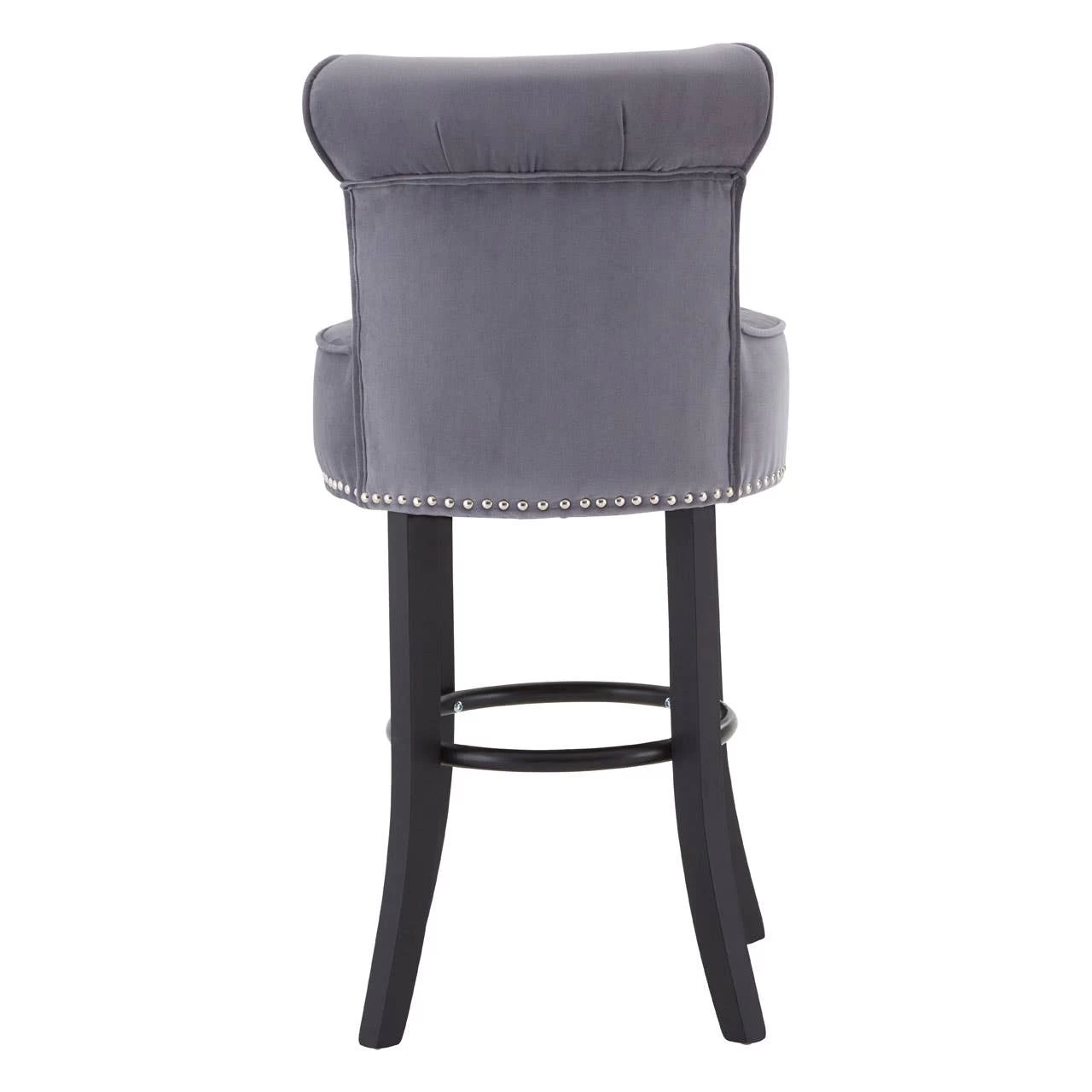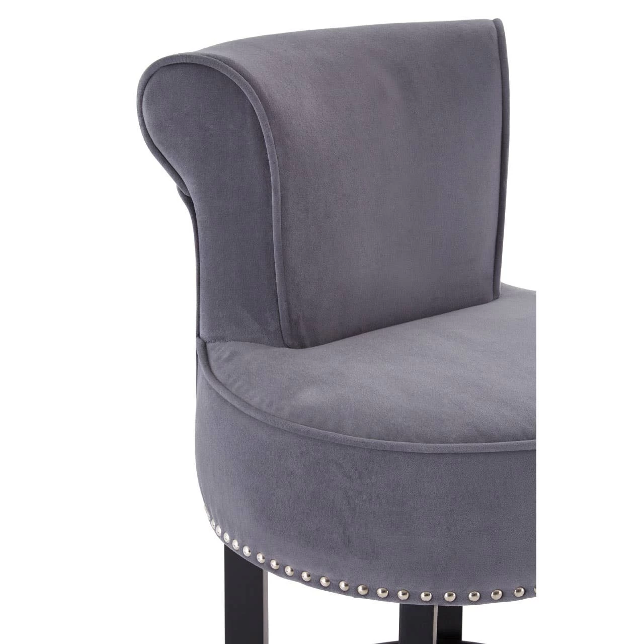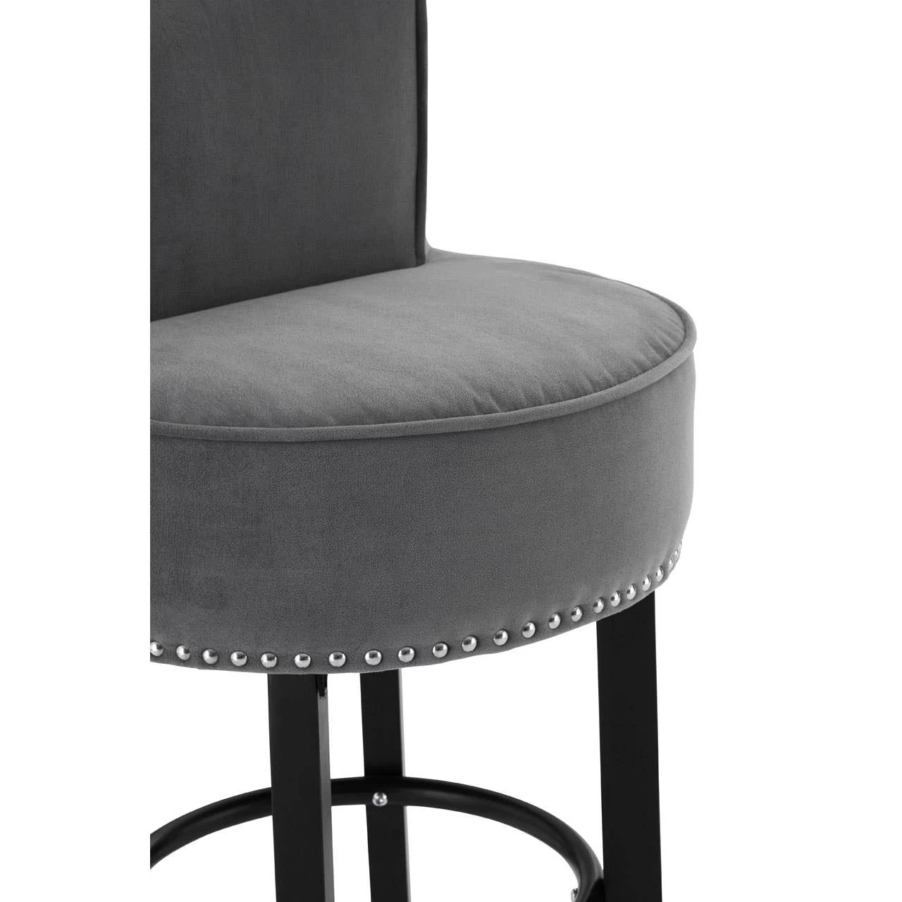 Inspired by classical design, this elegant seating for the home bar area is upholstered in polyester velvet. Its grey finish is perfect for styling with other muted tones. Silver studs on its apron produce a metallic contrast. Made from sustainable tropical hevea wood, its black legs gently curve, with a footrest which adds to the chair’s comfort.