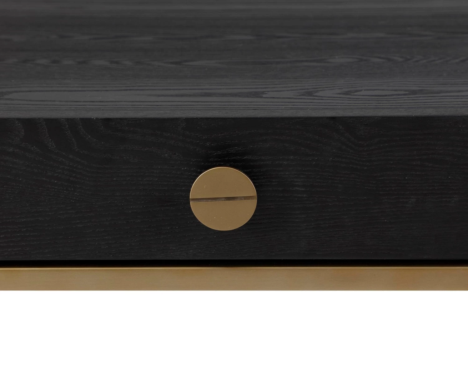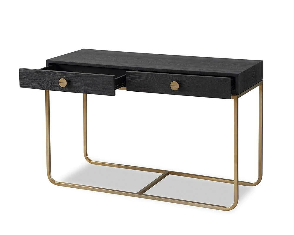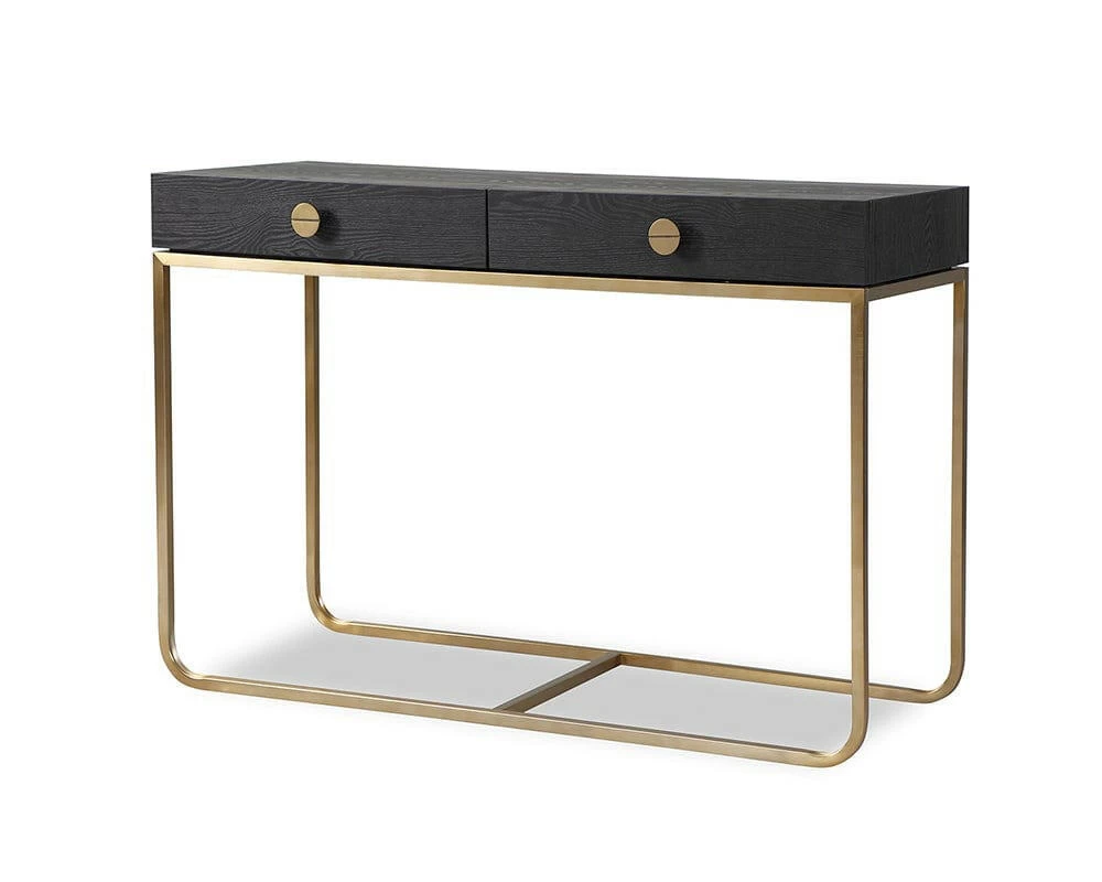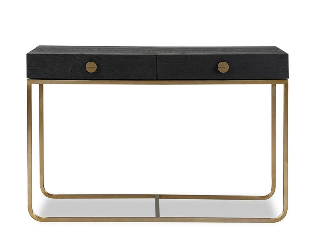 Crown Ash Veneer / Black Ash Finish / Brushed Brass Finish Our Rhapsody console / dressing table is a sleek and modern combination of beautifully figured crown ash veneer and brushed brass. In our signature Black Ash finish it has style and substance with two drawers punctuated with slotted rivet handles and elevated on an elegant brushed brass finish base strengthened by a central stretcher. Part of our Rhapsody collection it is perfectly paired with its matching cabinet or side table to complete a stylishly coordinated interior.