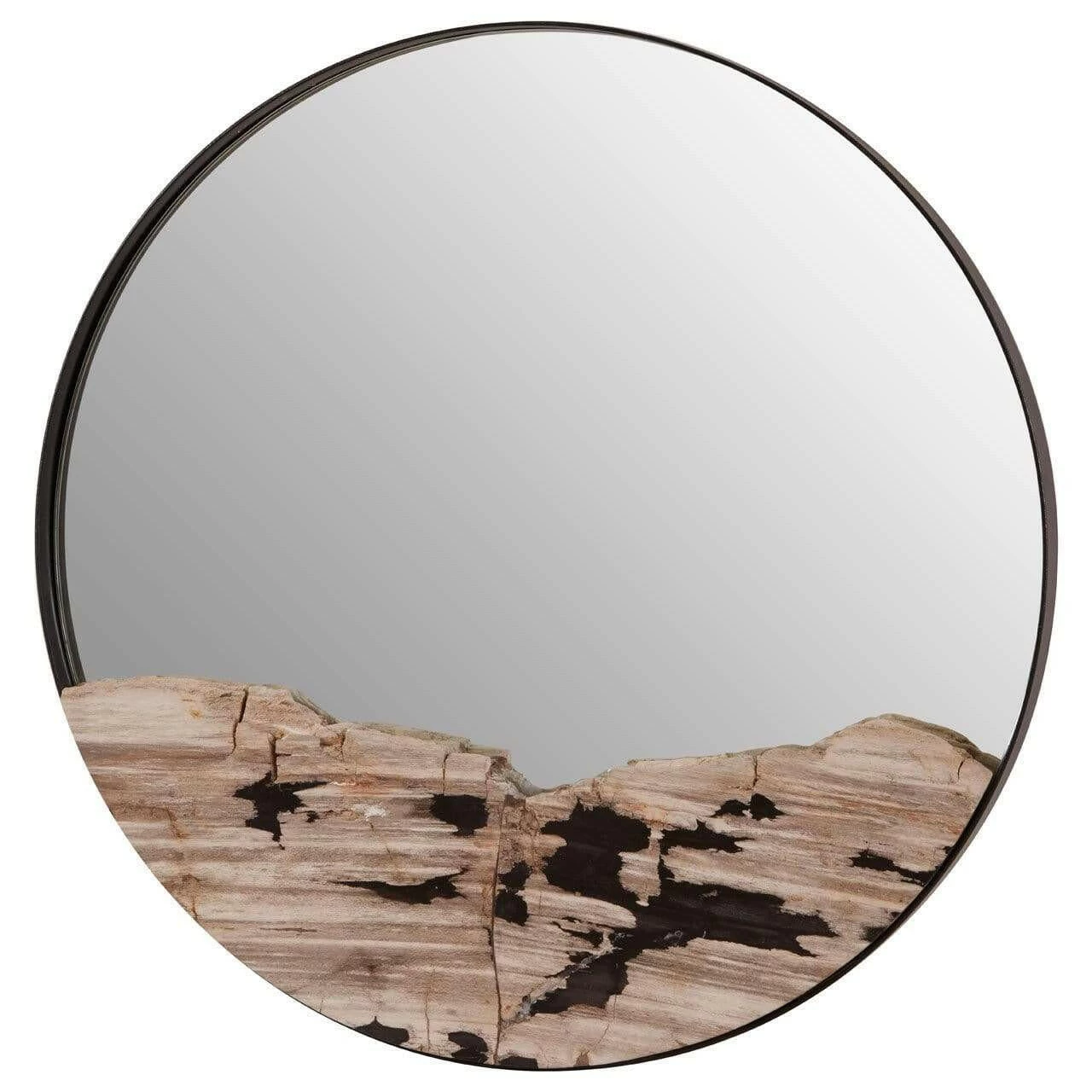 This attractive and high-quality round wall mirror features a metallic silver tile and natural rich petrified wood graining that creates a distinctive pattern.