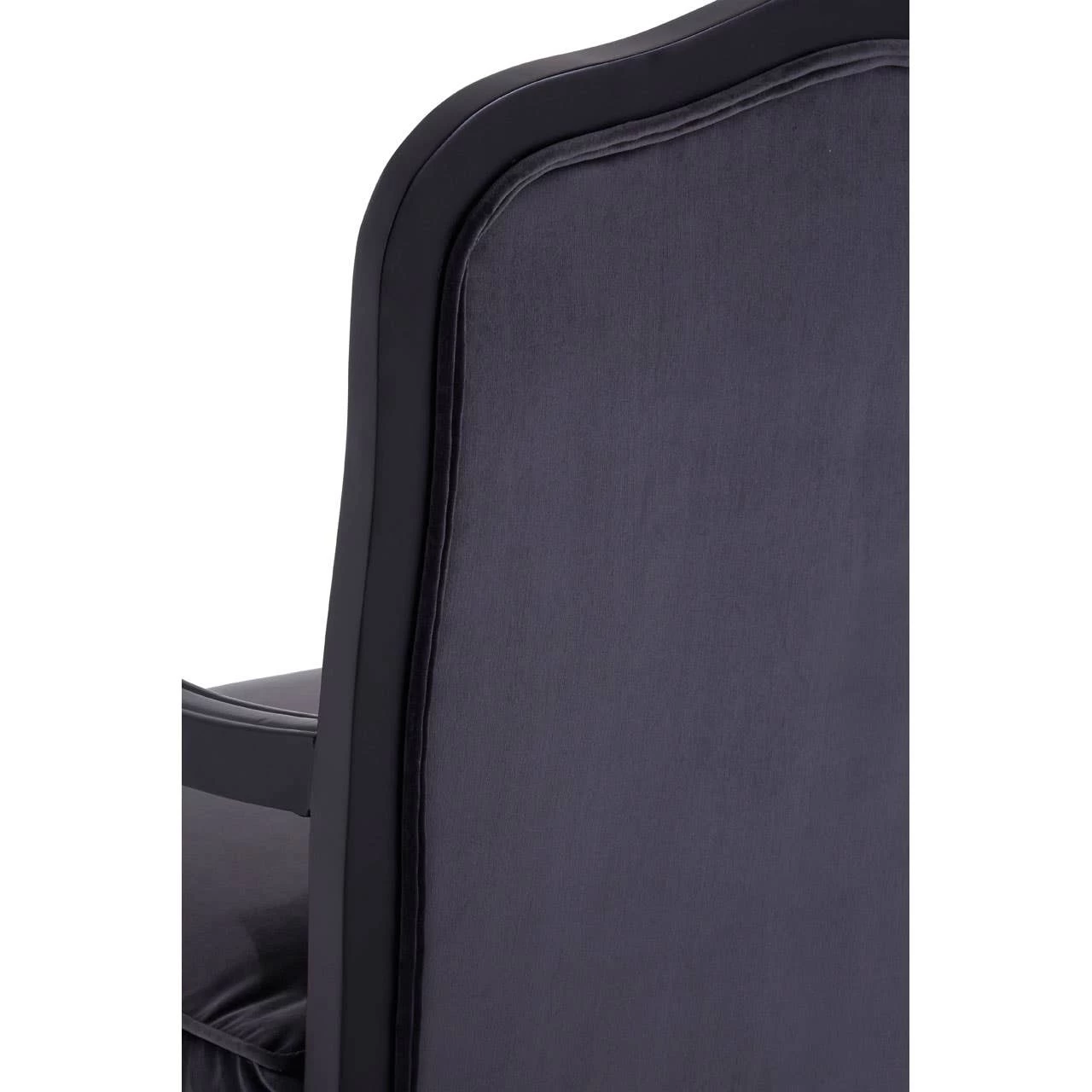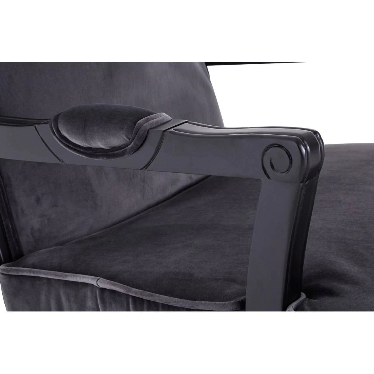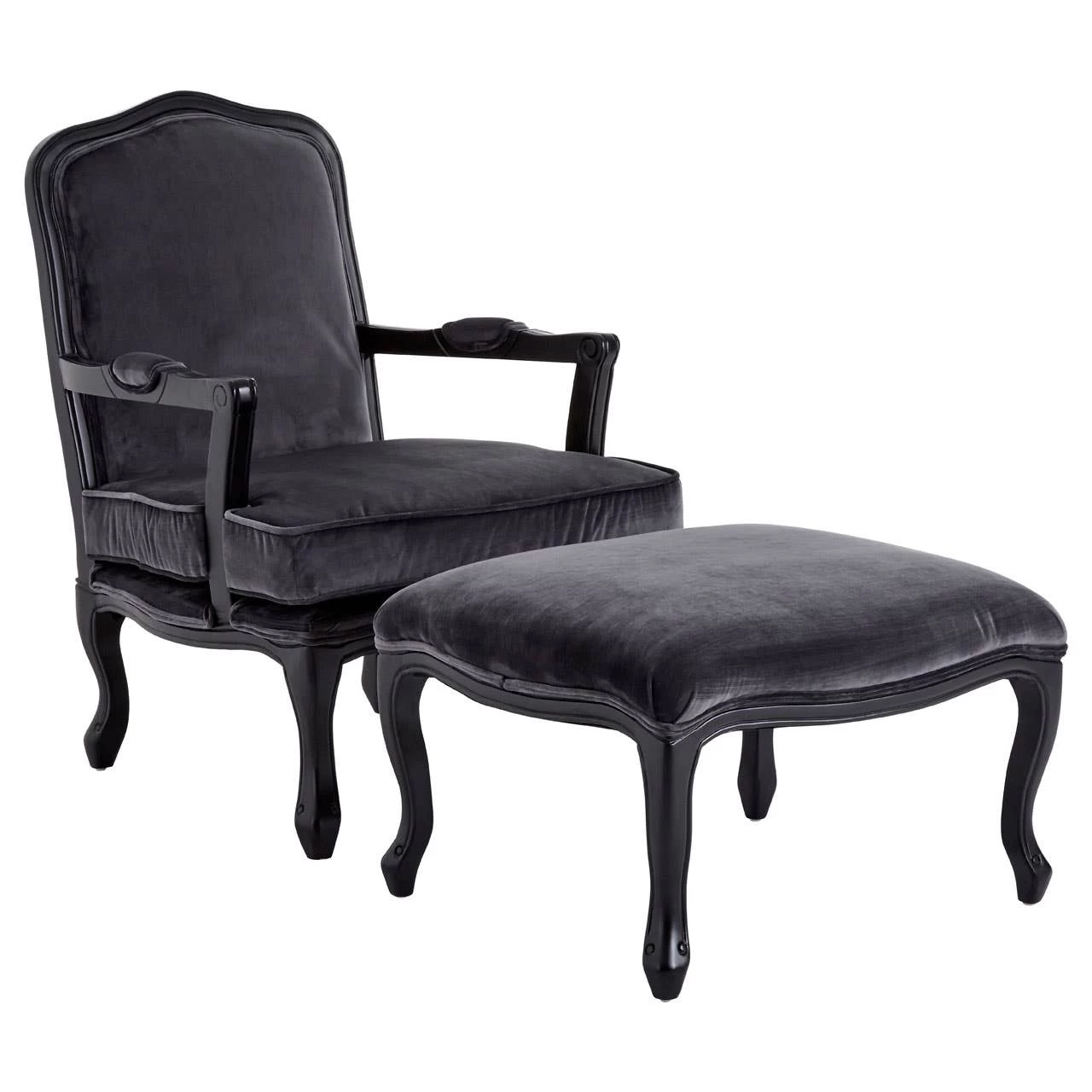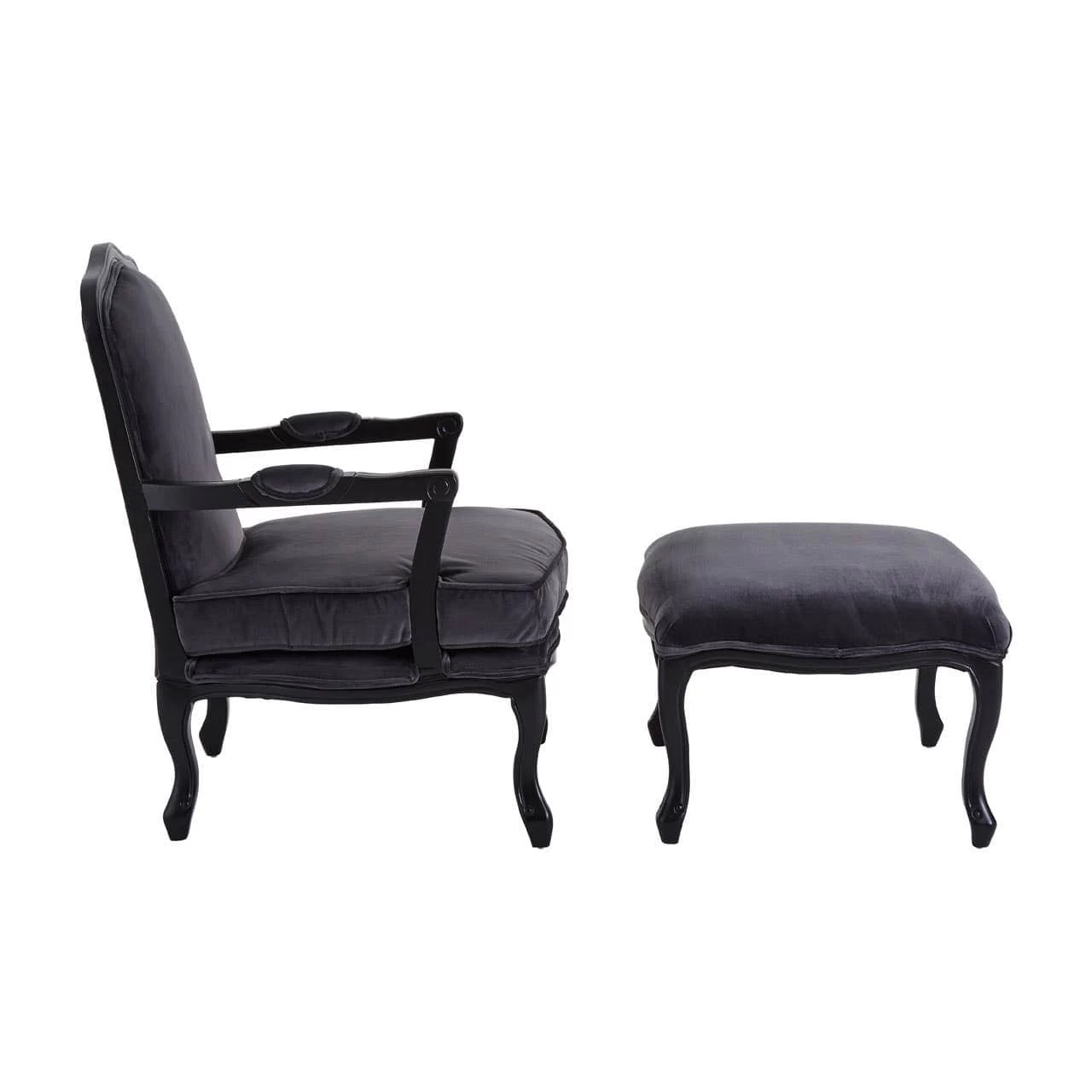 The velvet upholstery makes this chair and footstool set soft to the touch and luxuriously comfortable. The dark grey fabric and black painted wooden frame give this set an imposing presence in the living room. Like the rest of the Rococo range, the chair has a cushioned seat, and padding on the footstool and back rest.