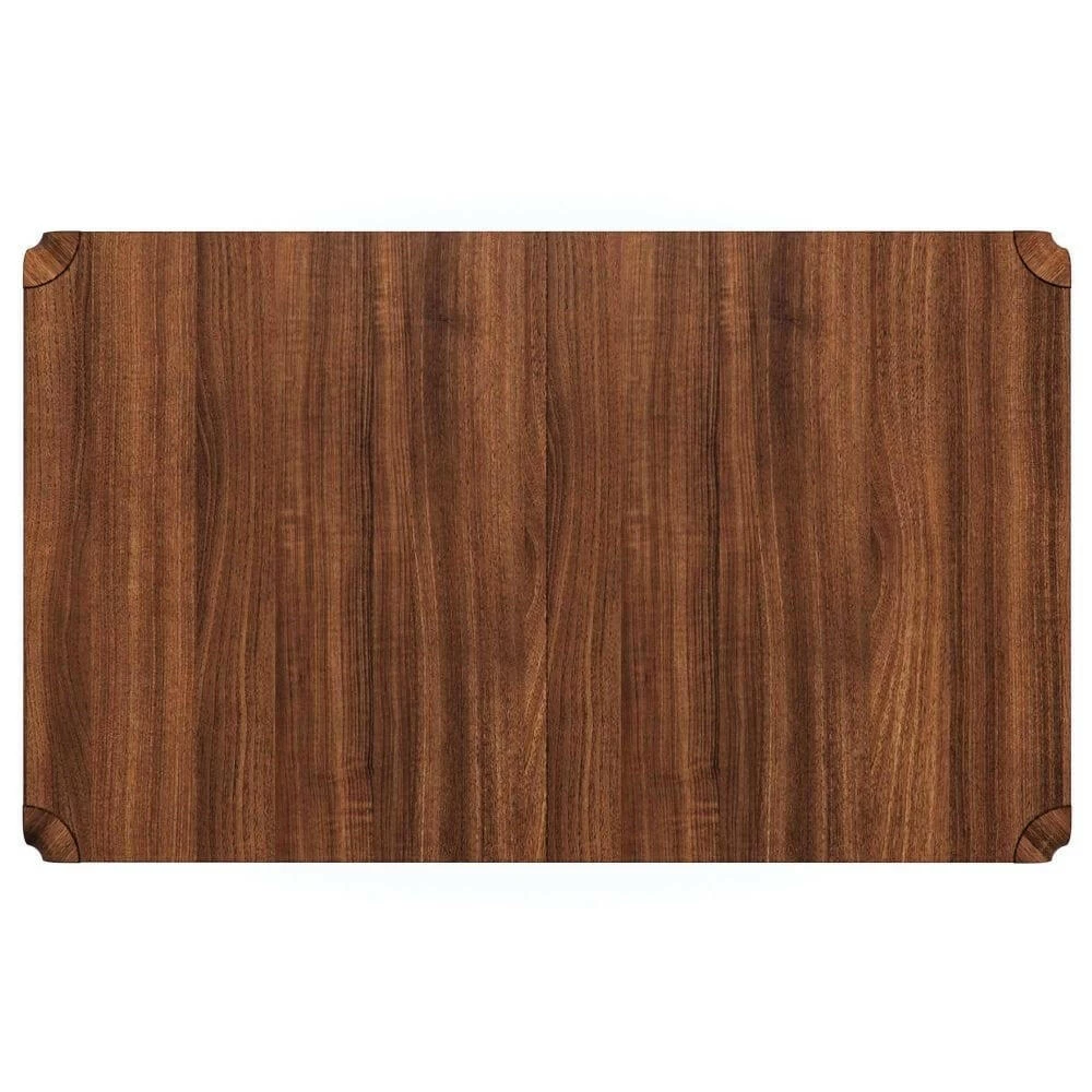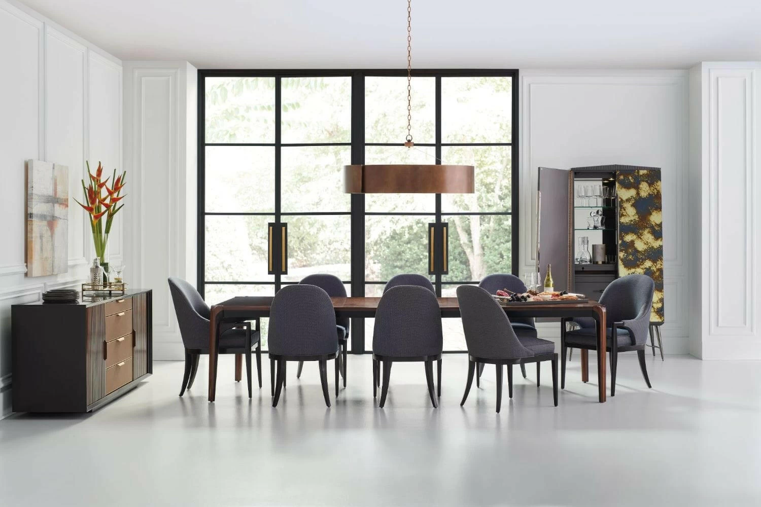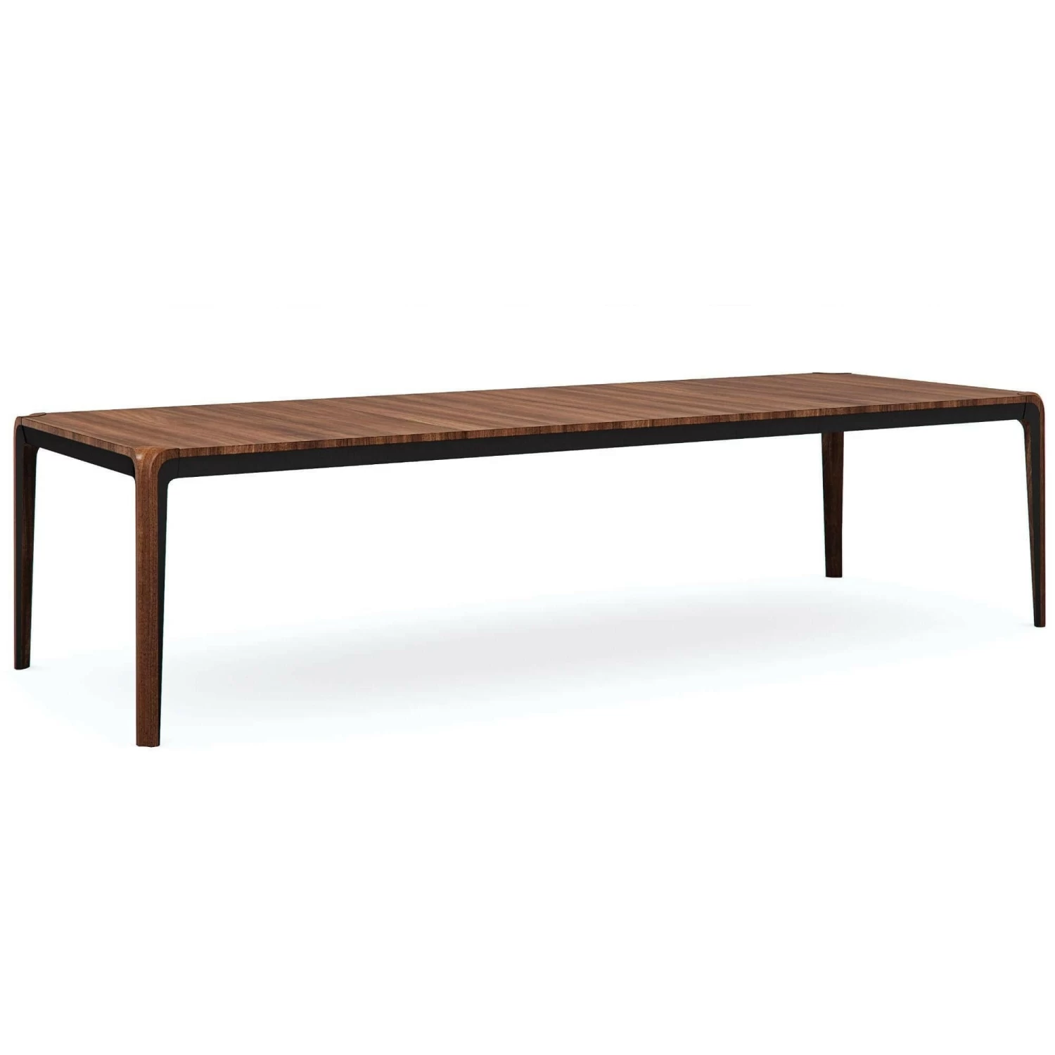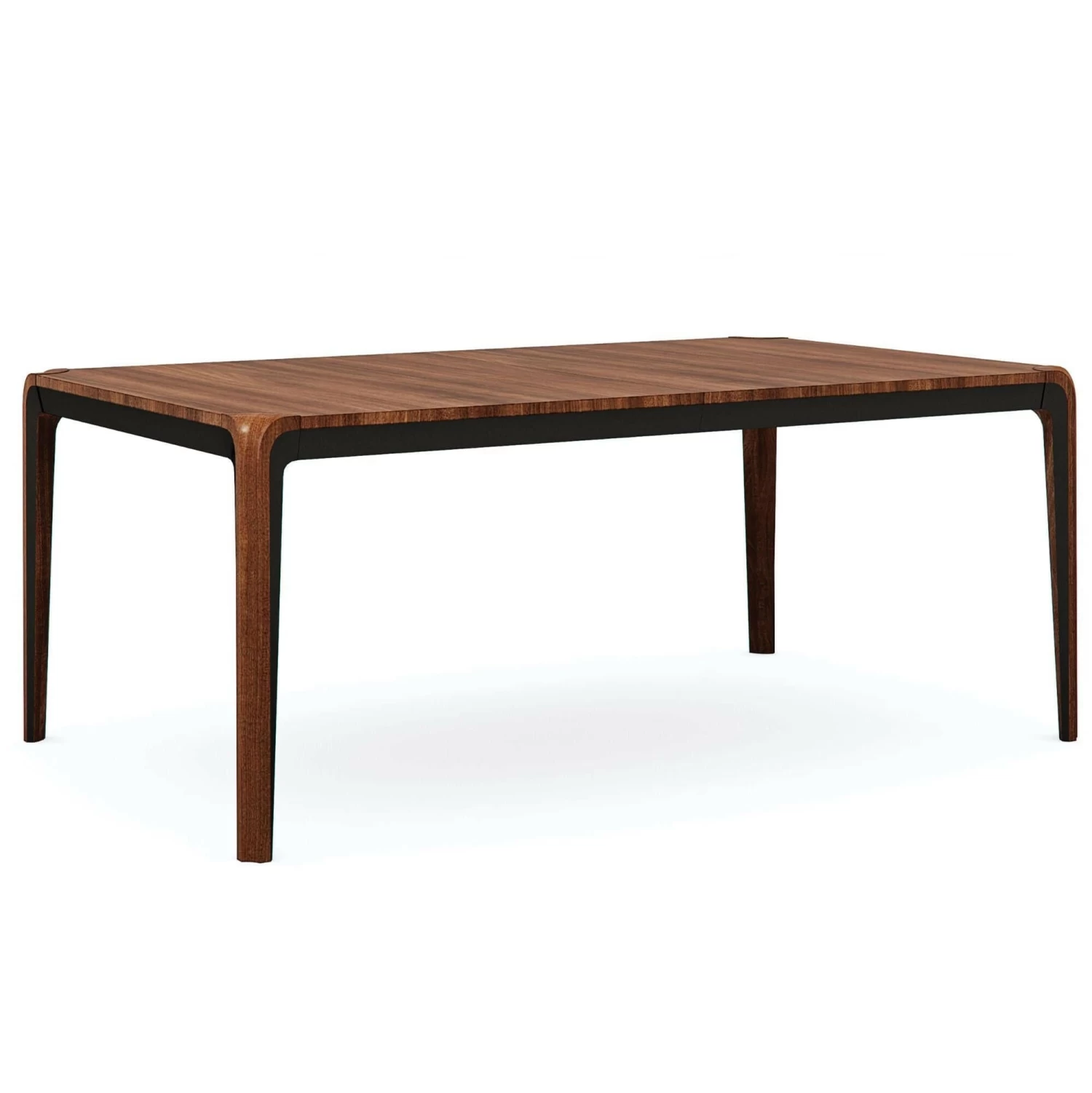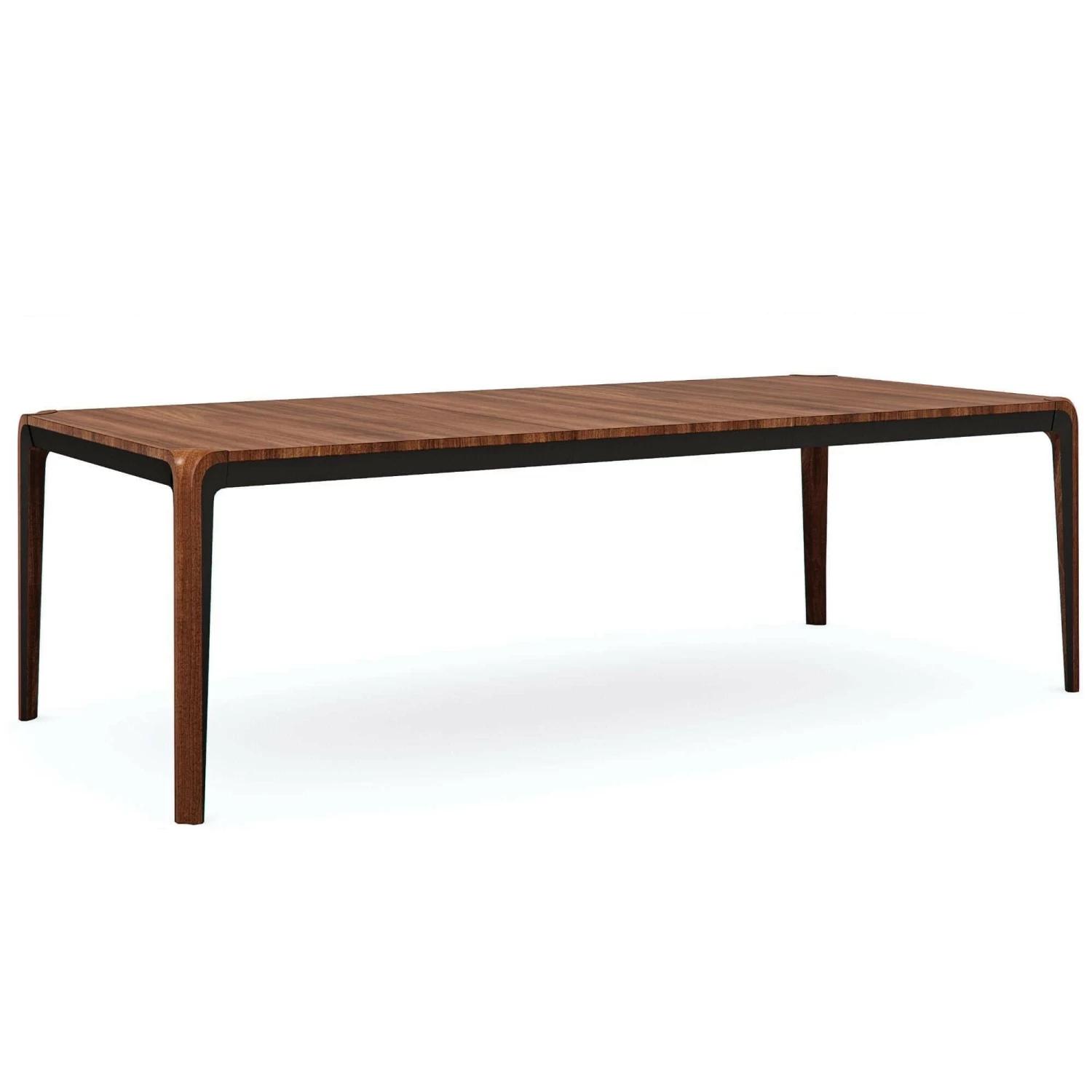 There’s always room for more with this extension dining table, evoking a balance between refined simplicity and modern functionality. Highlighting the intricate wood grain, the tabletop is finished in Rich Walnut with mitered edges in Dark Chocolate. Tapered legs, also trimmed in Dark Chocolate, appear to flow from the tabletop like a waterfall. Comfortably seats 8 without leaves, and seats 14 when fully expanded with three leaves. Table finished in Rich Walnut with Dark Chocolate accents. Table extends to 145 in with (3) 24 in leaves. Center leg support for stability when using leaves.