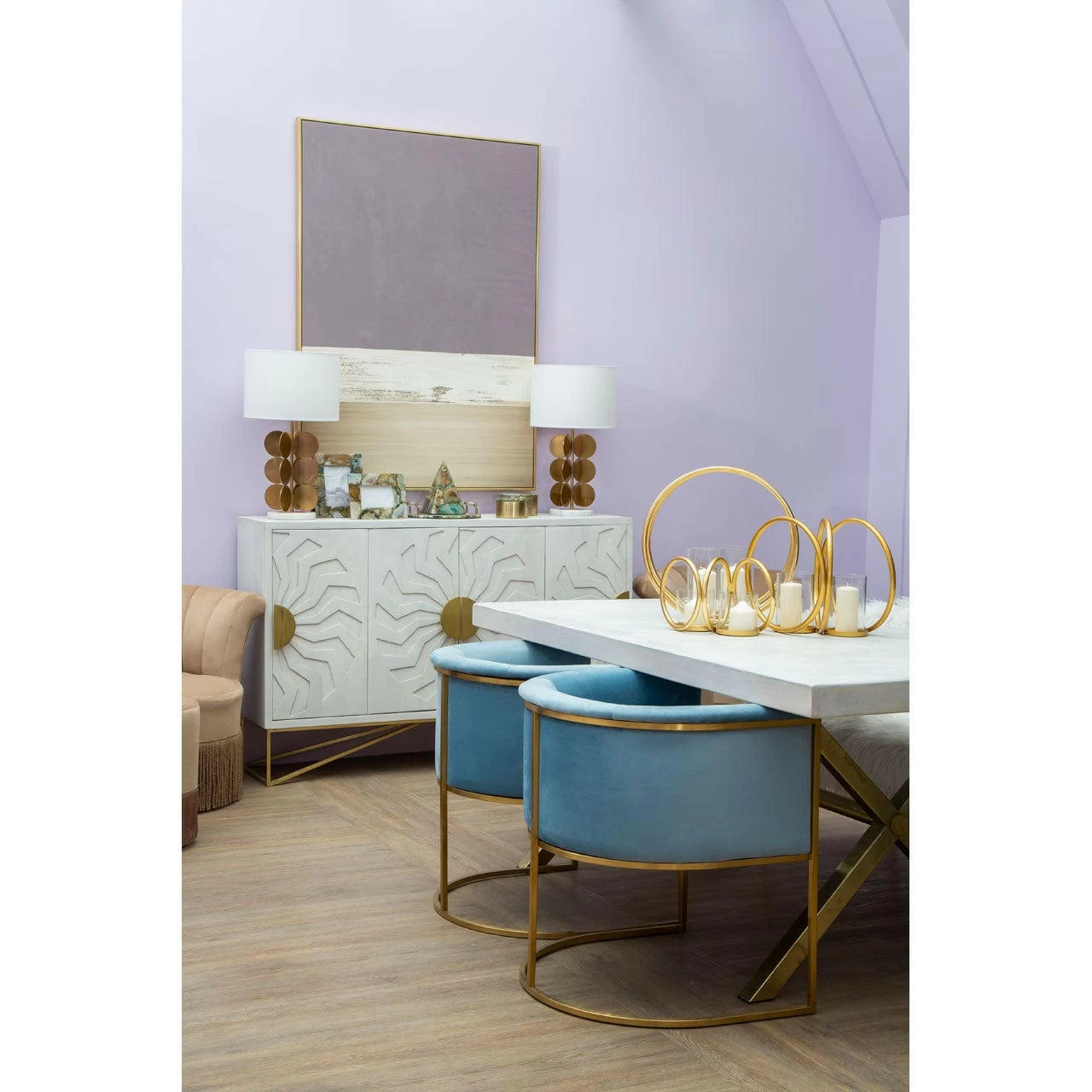 This dining table is crafted from mango wood with a whitewash finish. Its long, rectangular surface with tough iron legs has an antique brass colour that offers a tonal counterpoint to the white.