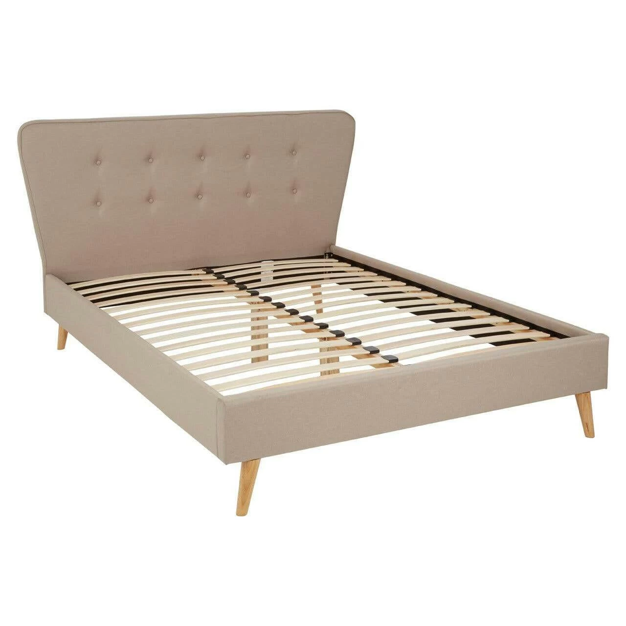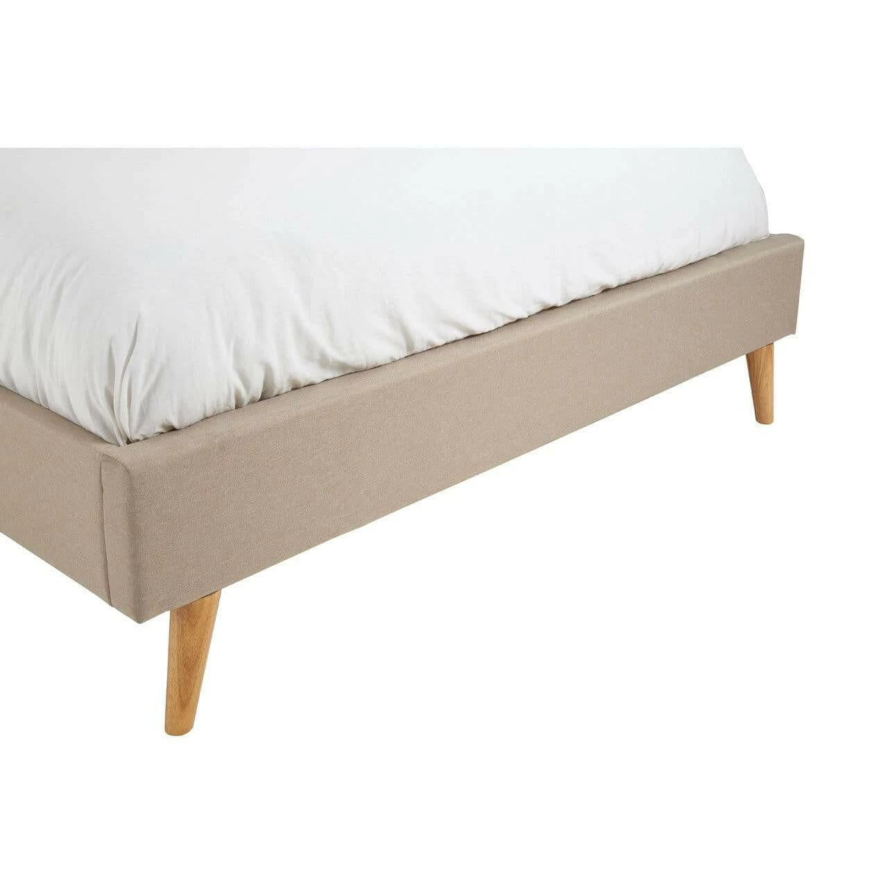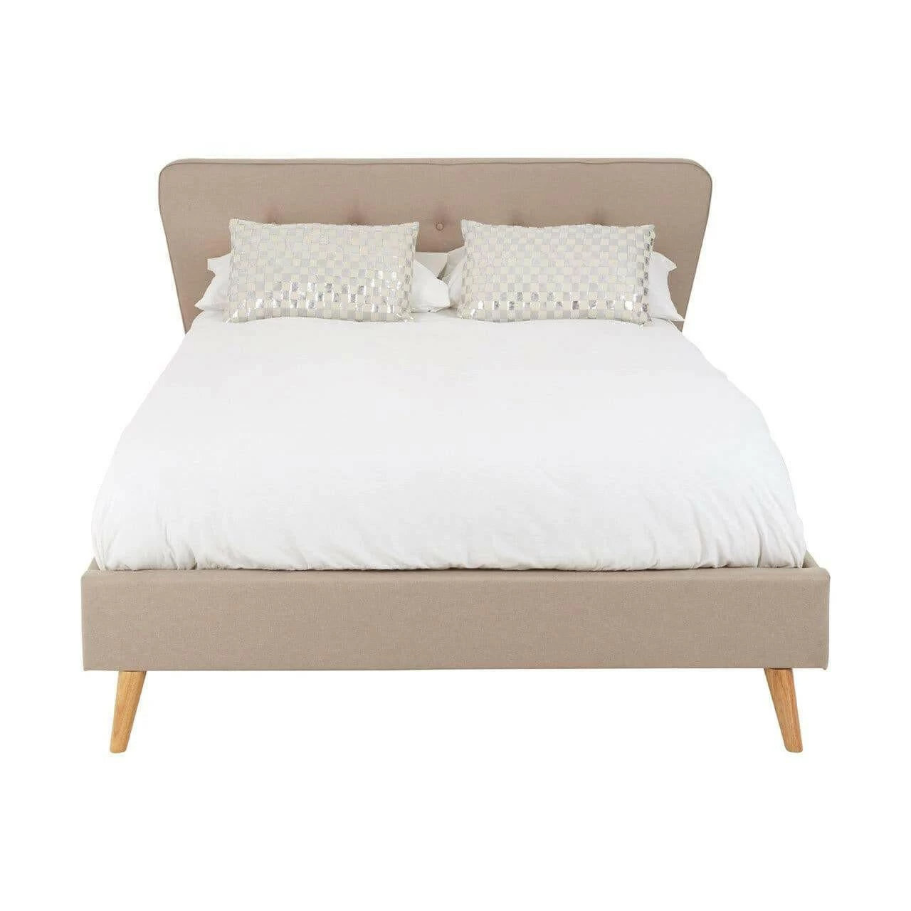 Upholstered in beige hopsack fabric, this bed’s headboard has a button detail while its subtly curved tapered ends make a stylish statement. Complementing the muted colour scheme, the natural finish oak wood legs further its grace.