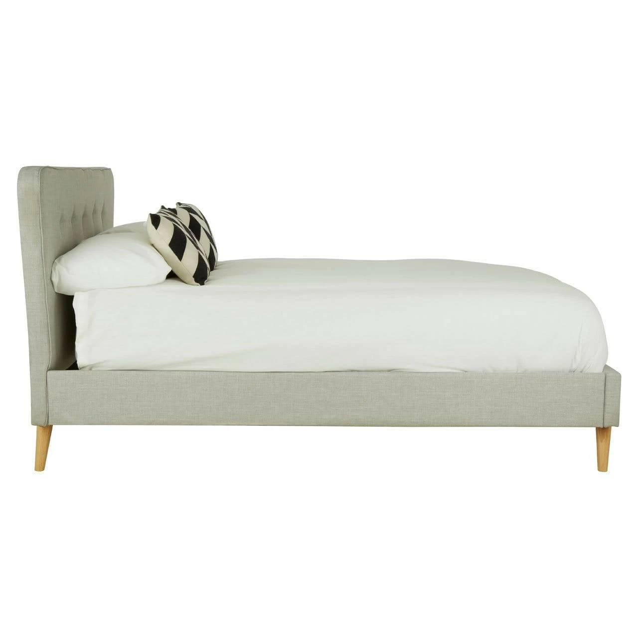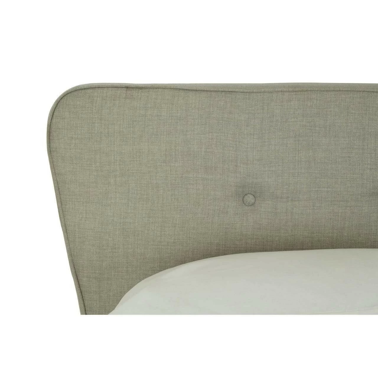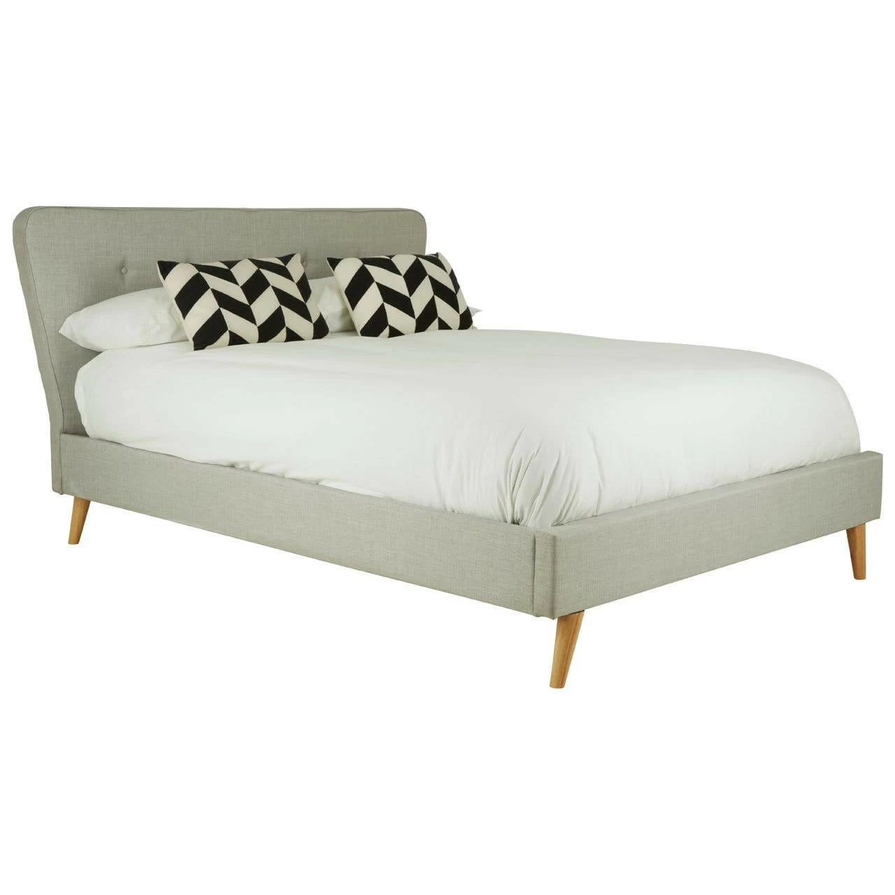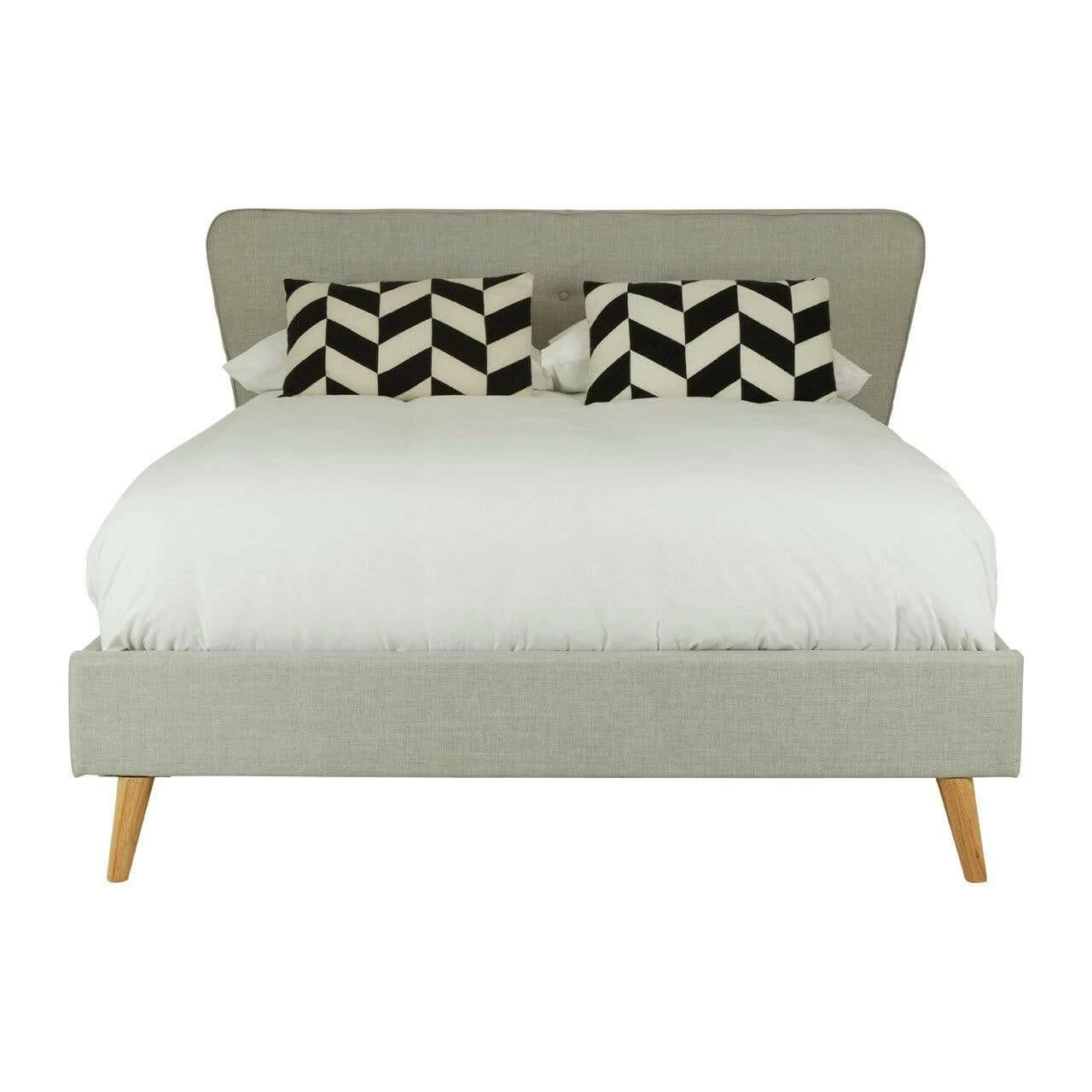 Upholstered in light grey hopsack fabric, this bed’s tall headboard has a button detail while its subtly curved tapered ends make a stylish statement. Complementing the muted colour scheme, the natural finish oak wood legs further its grace.