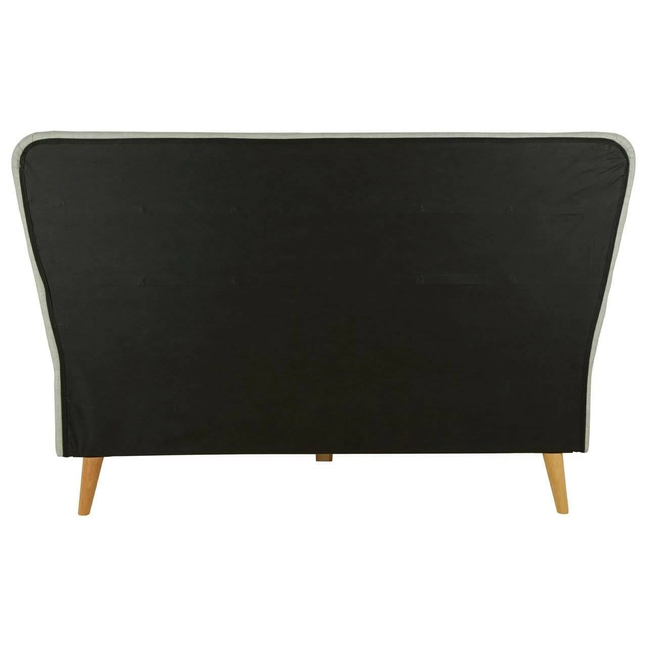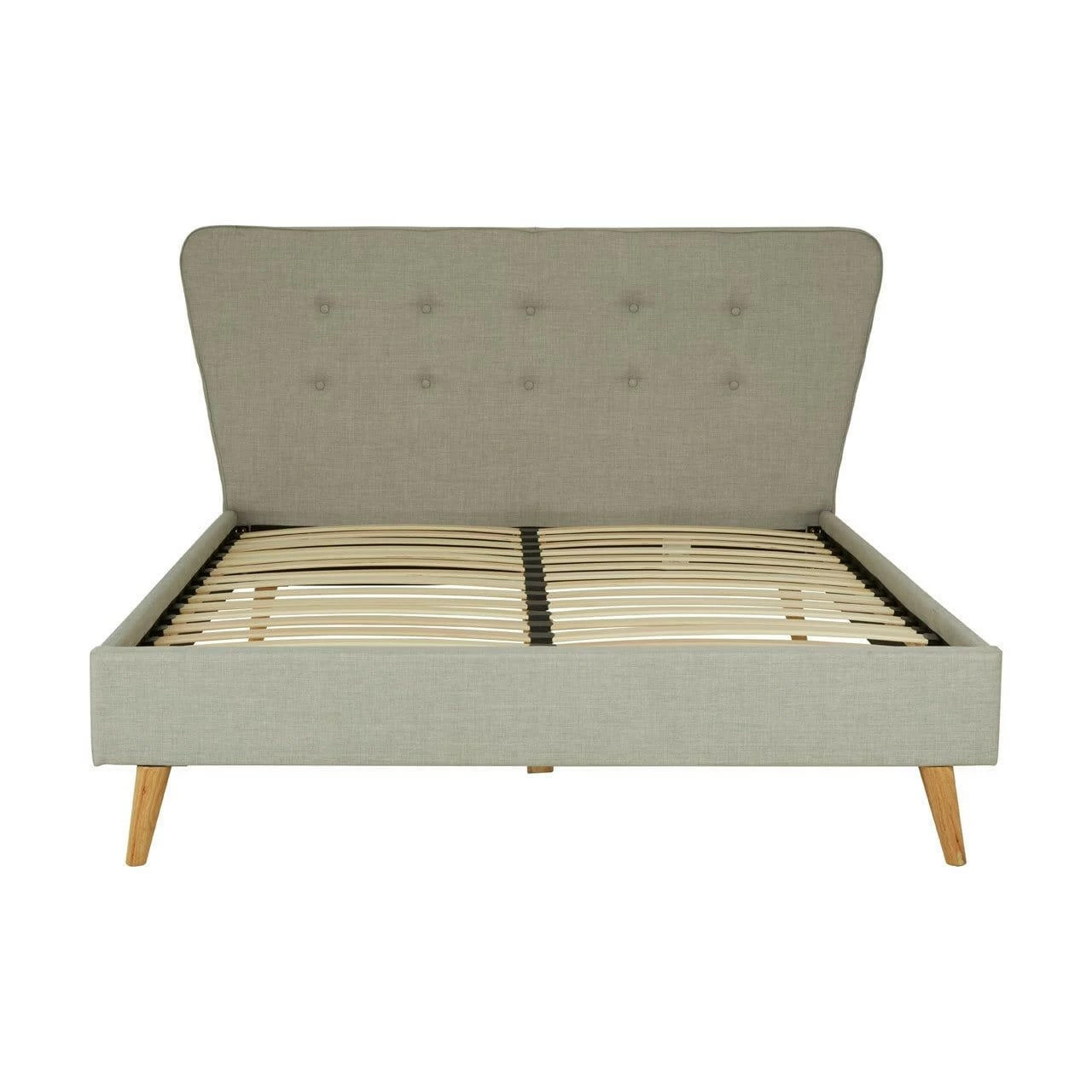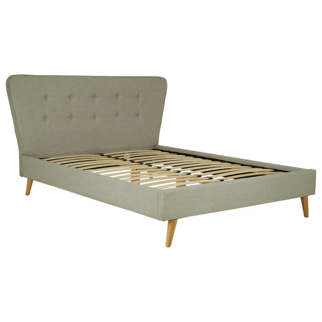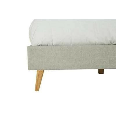 Upholstered in light grey hopsack fabric, this bed’s tall headboard has a button detail while its subtly curved tapered ends make a stylish statement. Complementing the muted colour scheme, the natural finish oak wood legs further its grace.