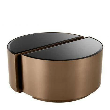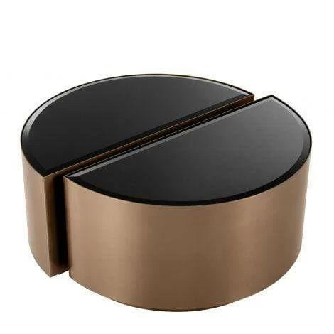 This stunning set of 2 semi-circular Astra Side Tables will give you a lot of layout options. Each table has a brushed copper base and a half round table top of bevelled black glass. Personalise to your liking: use each table as a single piece, near the armrest of your sofa, transform it into a night stand, place it against a wall as a low console, or pair together to form a round side table.