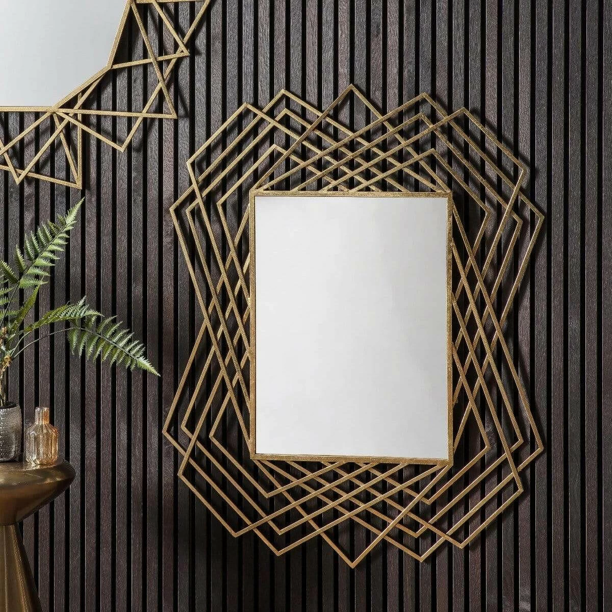 Striking feature mirror with a bold geometric frame in an burnished copper finish