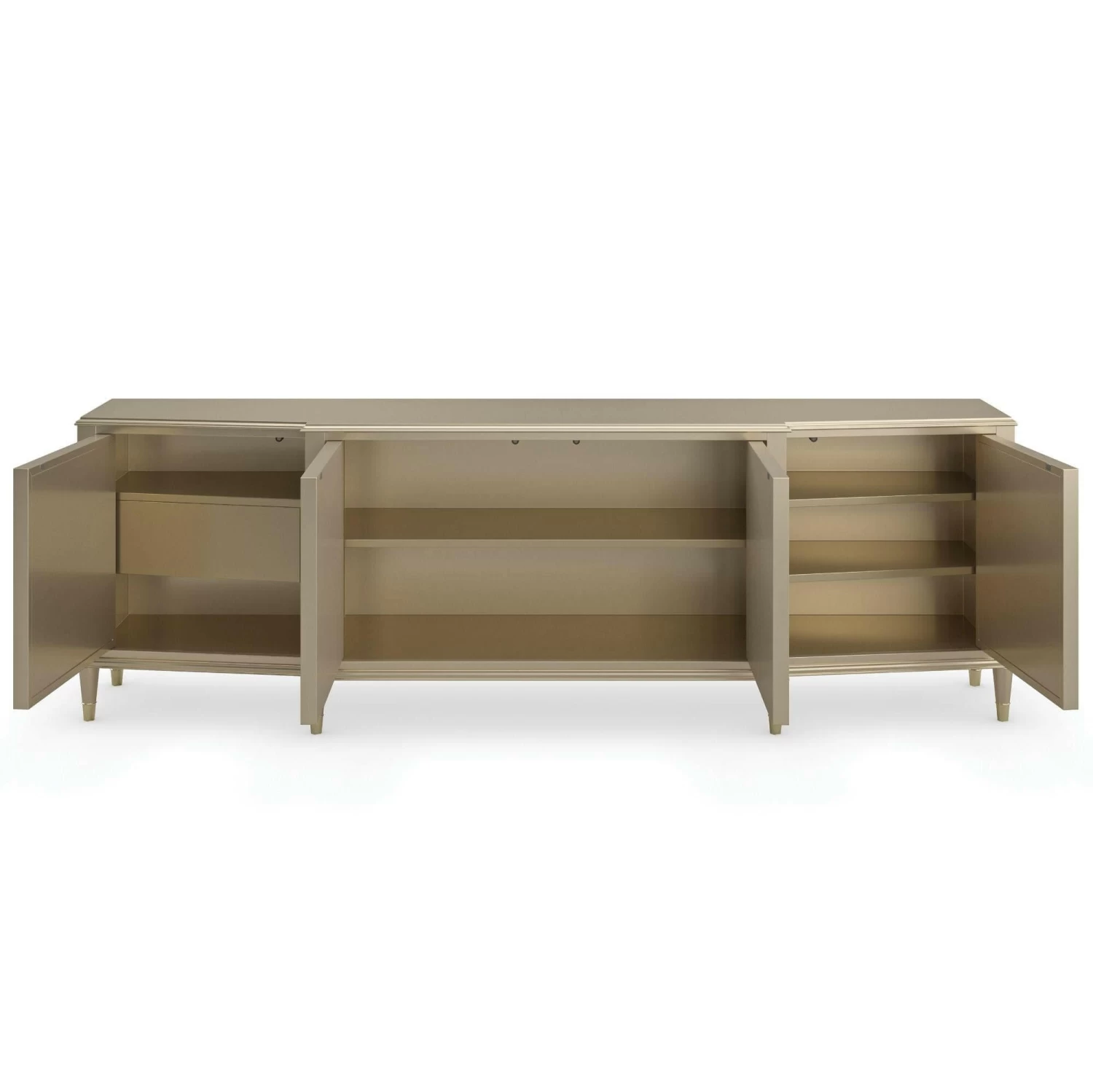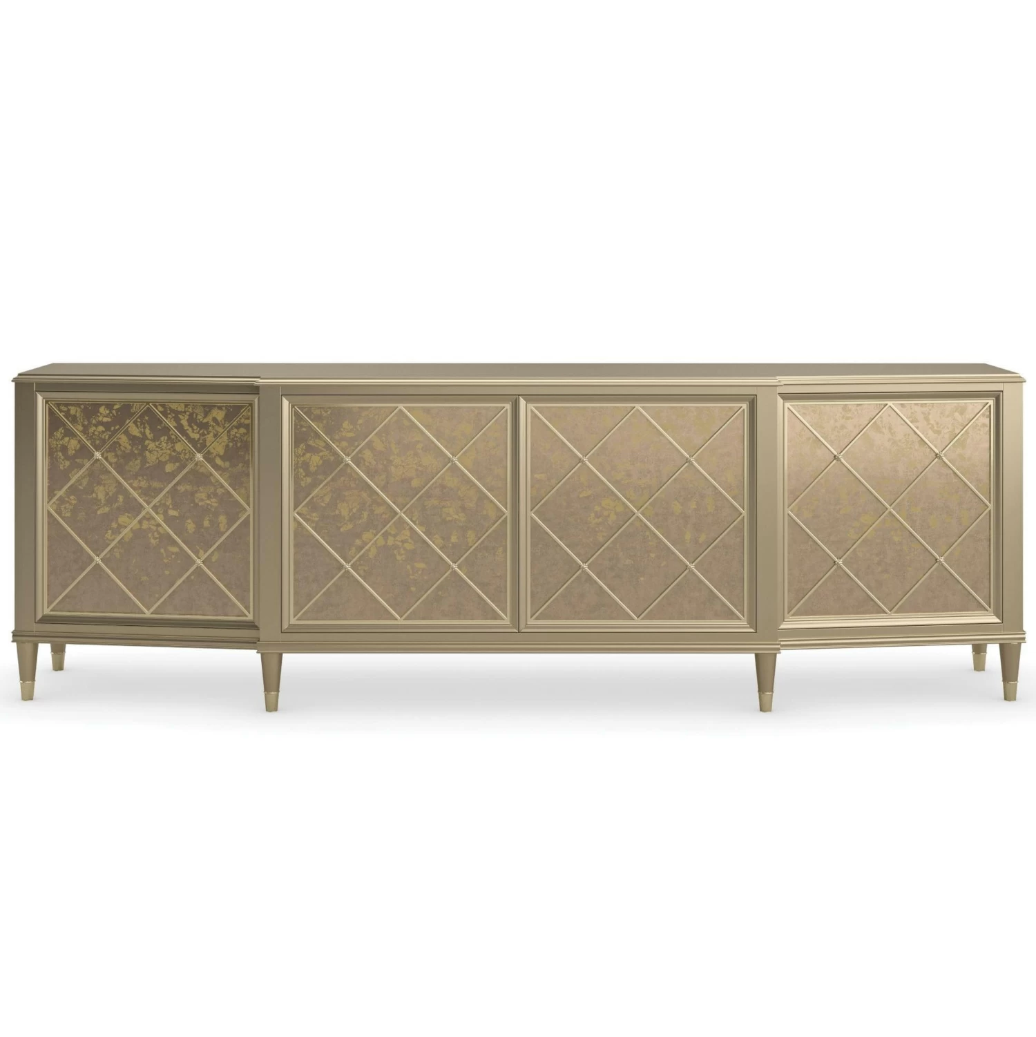Inspired by a mercury glass vase the designer found in a Paris flea market, this console introduces a luxe mix of materials and finishes. Random flakes of gold mingle with layers of silver leaf to create a cascading pattern and unforgettable centrepiece. An elegant metal trellis with rosette accents overlays the doors in a Whisper of Gold for added dimension and allure. Generous storage features adjustable shelves, open storage and a drawer for organization, with cut-outs for wire management along the back. Metal ferrules add a classic detail and note of distinction. Case finished in Soft Silver Paint. Four touch latch mirrored doors in Silverleaf with backed ombre finish. Metal grill in Whisper of Gold with rosettes. Behind center doors is an adjustable shelf. Behind right door are two adjustable shelves. Behind left door is drawer with side guides and open storage area. Wire management holes in the back. Metal ferrules in Whisper of Gold.