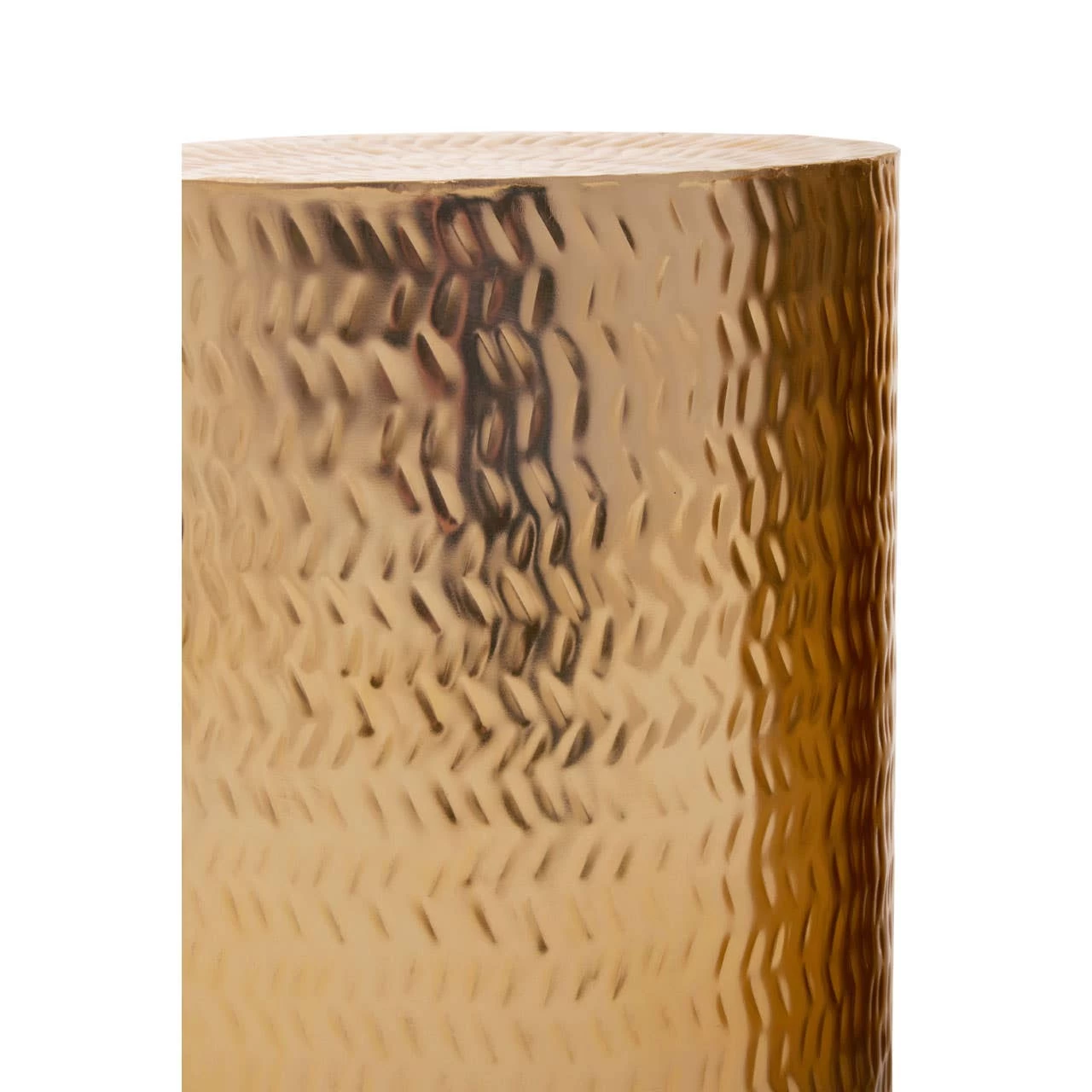 Intricately handcrafted, this set of two iron stools in the warm metallic finish boasts a series of diagonal indentations. Featuring a cylindrical shape, the irregular chevron pattern across the surface will create an instant focal point.