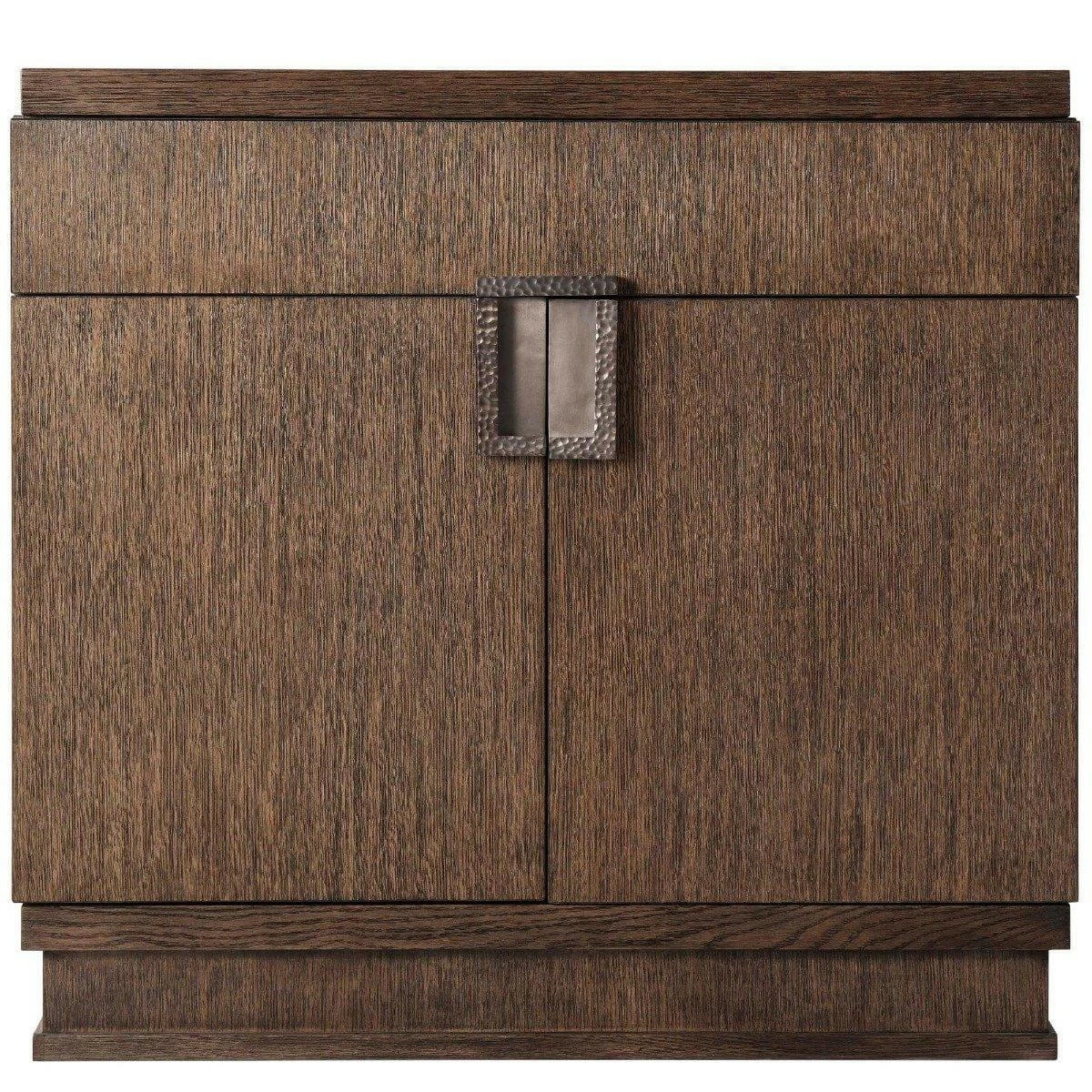 Nightstand, Quartered Oak Veneered with Charteris Finish, Rectangular Top above Frieze Drawer and Two Cabinet Doors, Triple Integrated Brass Finish Handle with Hammered Design, Recessed Plinth Base