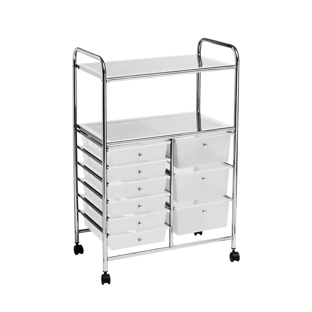 This trolley’s frame is made of robust metal, with a chrome finish that gives it a sleek look. Black caster wheels and curved, easy-to-grip handles make it easy to transport. Store a variety of items in its six shallow and three deep drawers. Above the drawers, a pair of open shelves offer further versatility.
