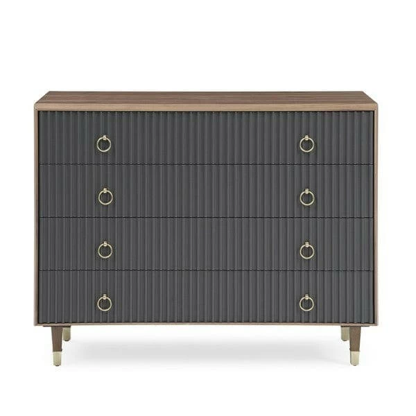 The Trueno Dresser exudes chic elegance with its unique design and meticulous craftsmanship. The cabinet, featuring a walnut veneer finish, offers a rich and inviting texture, while the drawers, adorned with rib detailing in matte grey lacquer, add a touch of modern sophistication. Supported by solid timber legs finished in walnut, the dresser stands as a harmonious fusion of materials and styles. With four drawers equipped with brass handles, this piece offers both storage and style. The Trueno Dresser’s distinctive combination of warm wood tones, sleek lacquer, and thoughtful design details showcases its ability to seamlessly blend into various aesthetics while making a striking statement that elevates the overall ambiance of any space.