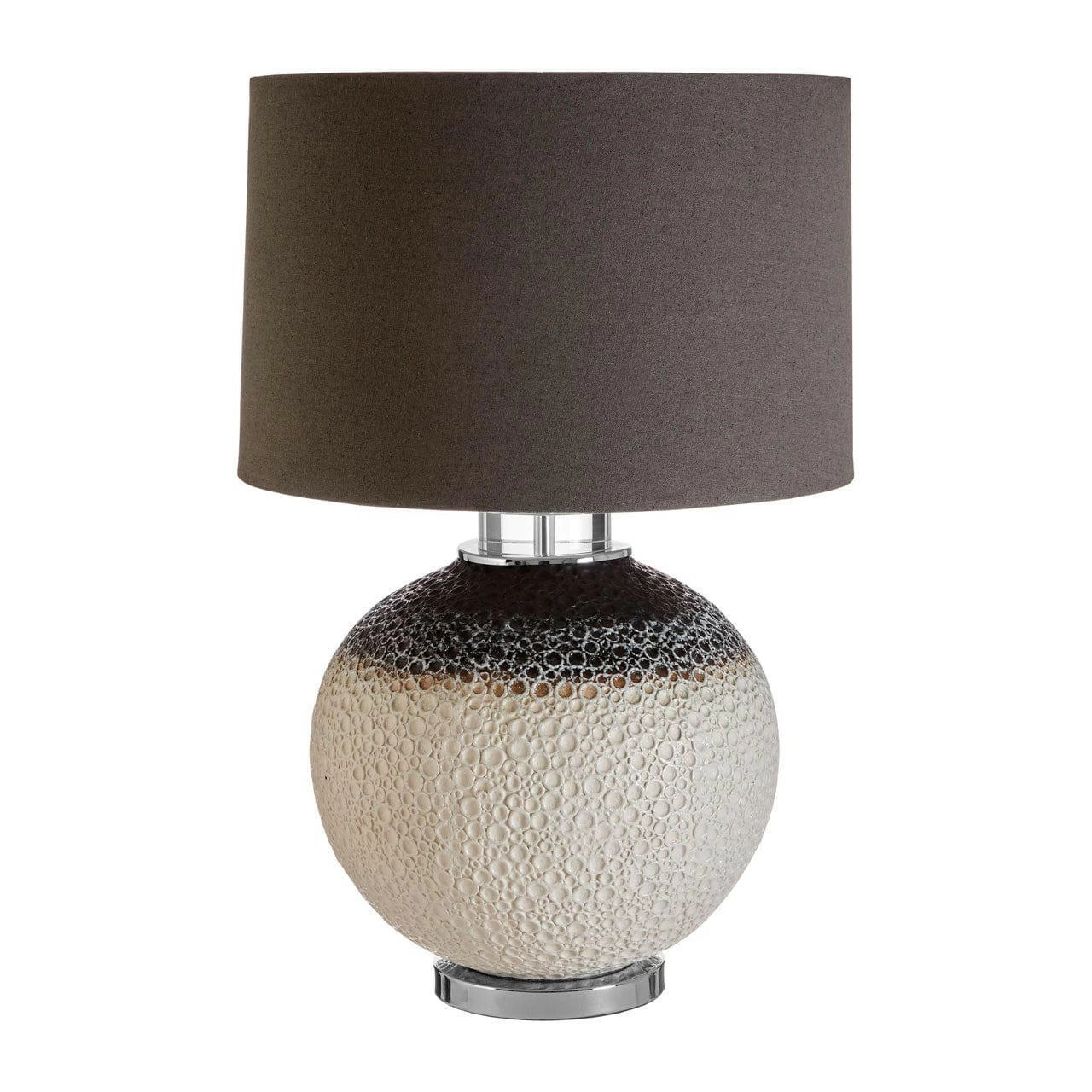 Its soft fabric shade is coloured dark grey to complement the upper section of the round body below. The dark grey top of the body diffuses into a creamy white tone, these subdued colours countered by the reflective chrome metal base. The body is formed from ceramic and is notable for its cratered surface.