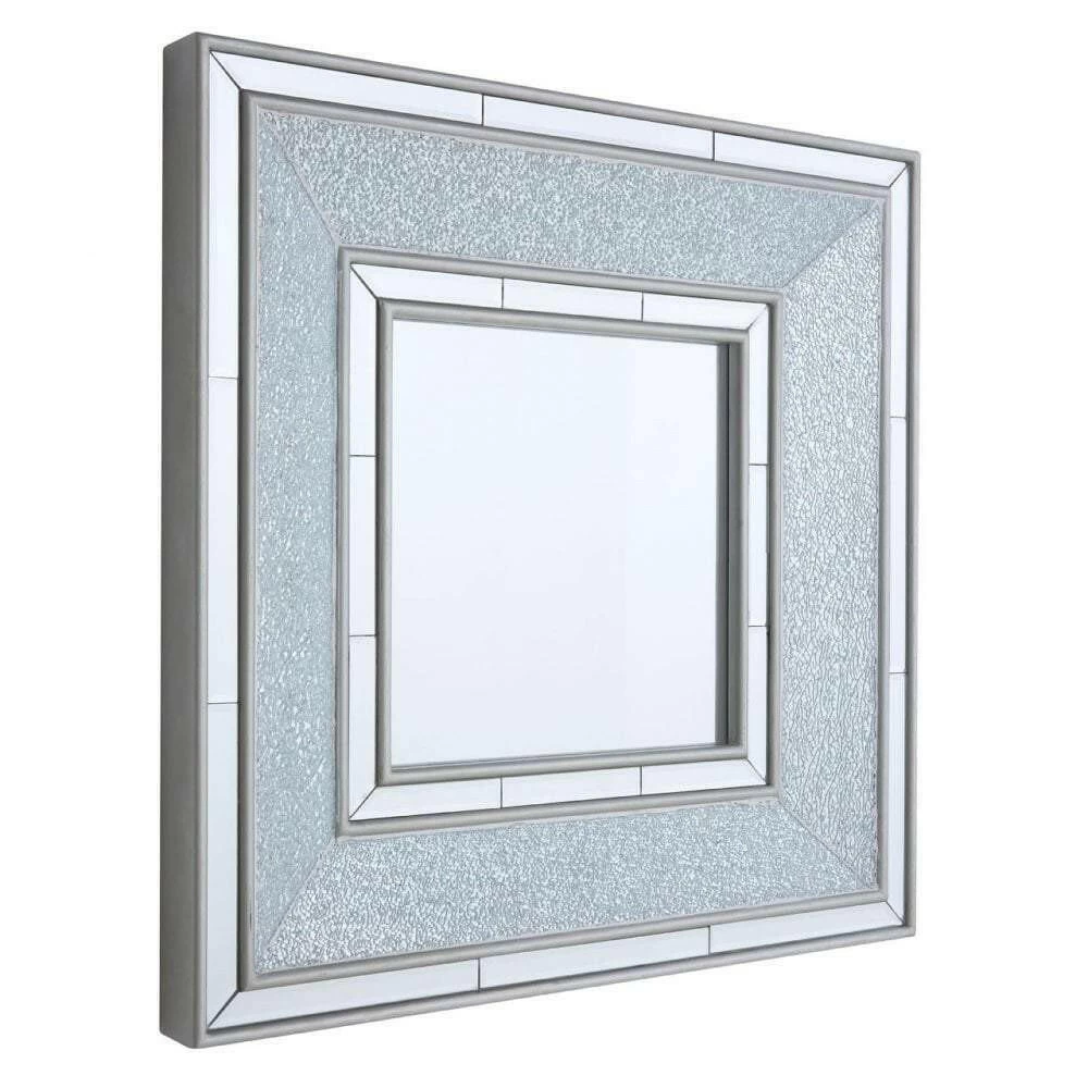 This stylish mirror has a distinctive double border made from reflective glass. Between both borders sits a layer of glass mosaic, silver in colour with splashes of contrasting black. Glistening under natural and artificial light, the mosaic feature enhances this mirror’s glamorous appeal. Coordinate it with silver metallics.