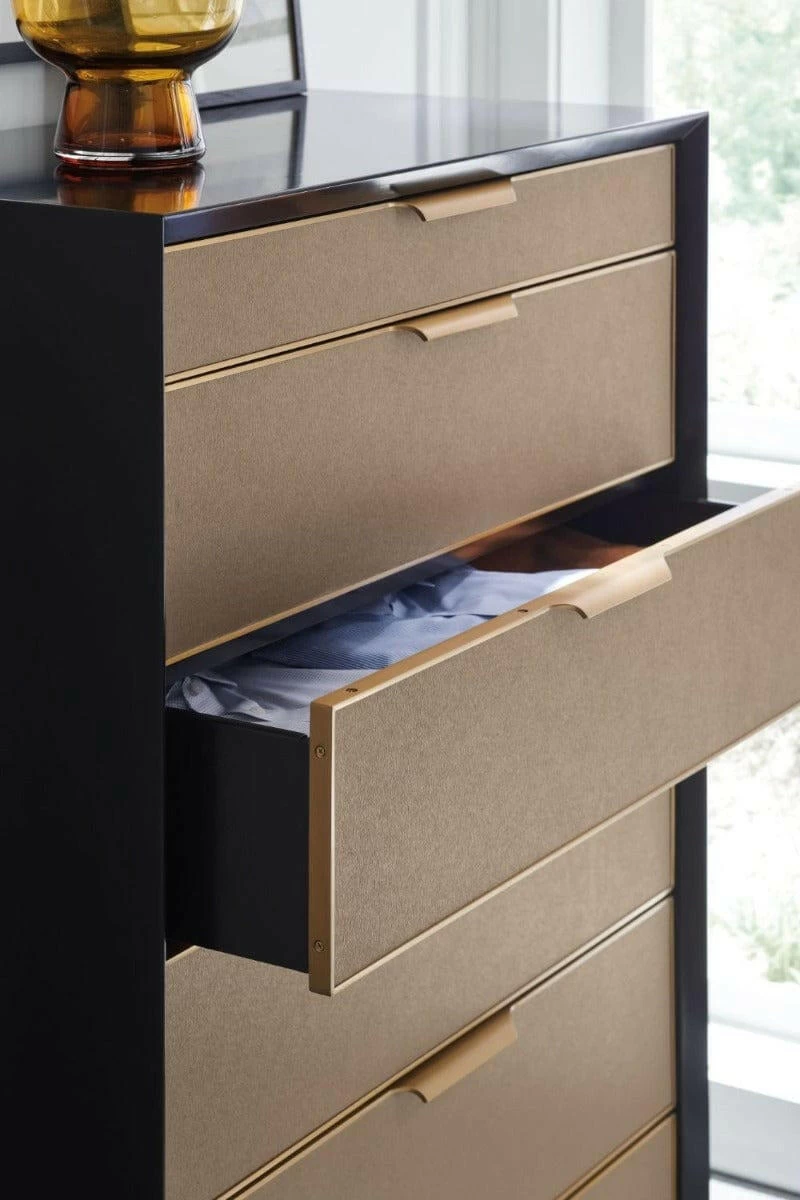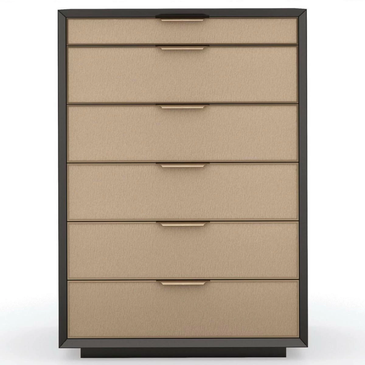 Introduce a sophisticated style to bedroom interiors with this architectural-inspired dresser, merging minimalism with elements of mid-century modern. Each drawer front is wrapped in a beautifully textured vinyl, embossed with a rivulet pattern like rain trickling down a windowpane. Metal trim in Champagne Gold artfully incorporates rounded pulls to seamlessly frame each drawer, designed to open and close with ease. A felt-lined top drawer is perfect for organizing cufflinks and jewellery. Case finished in Dark Chocolate. Metal trim in Champagne Gold. Six drawers with vinyl fronts and undermount soft close guides. Top drawer with felt lined bottom. Interior in Dark Chocolate. Plinth base in Dark Chocolate.